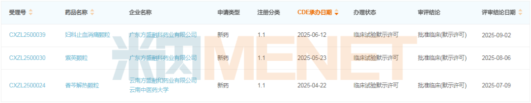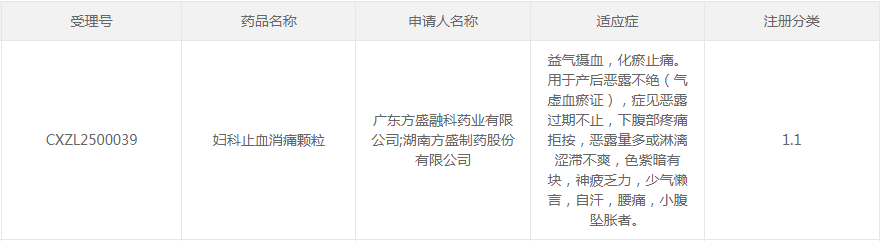 米内网数据显示,妇科止血消痛颗粒的临床申请(受理号:CXZL2500039)于2025年6月获得CDE承办,随后于今年9月获得临床试验默示许可。