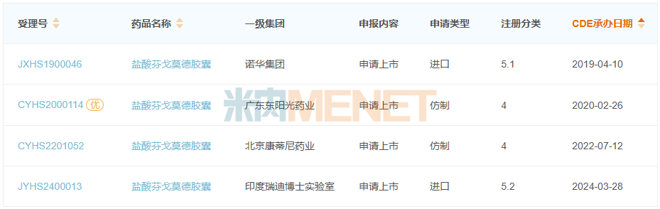 仿制药方面,广东东阳光药业在2020年首家申报仿制上市,并在近期获批国内首仿+首家过评,北京康蒂尼药业的受理号并未获批,印度瑞迪博士实验室的进口5.2类正在审评审批中。