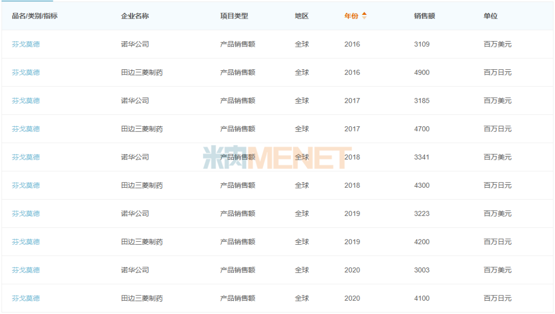 芬戈莫德是全球首个治疗多发性硬化症(MS)的口服药物,由诺华和日本三菱制药共同开发,2010年获美国FDA批准上市,全球销售额在2016-2020年保持在30亿美元以上。
