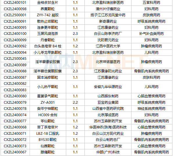 北京以岭药业的芪桂络痹通片、江苏康缘药业的六味地黄苷糖片、天士力医药集团的安神滴丸等11款为1类新药。河南利欣制药的柴胡鼻腔喷雾剂、黑龙江济仁药业的菖麻熄风颗粒2款为中药改良型新药。