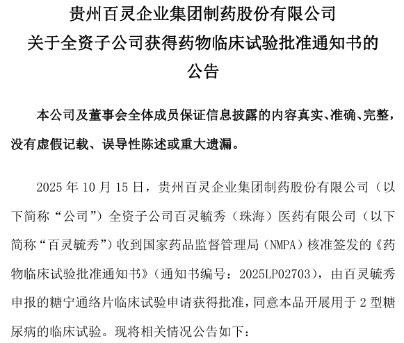 10月16日,贵州百灵发布公告,其全资子公司百灵毓秀(珠海)医药的糖宁通络片新增用于2型糖尿病的适应症获批临床。据了解,糖宁通络片在2024年11月获批开展糖尿病视网膜病变Ⅲ期临床,此次获批标志着该产品成为国内首个在“糖尿病治疗”与“并发症治疗”双领域进入临床试验的中药1.1类新药。受利好消息影响,公司当日股价涨停。