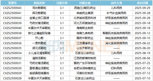 近年来,中药新药申报上市数量持续攀升。2025年至今有42款中药新药提交上市申请获CDE受理,数量已超过2024年全年。从今年单季度数量来看,第三季度最多,有17款,第二季度有12款,第一季度有13款。从治疗大类来看,涵盖消化系统疾病用药、神经系统疾病用药、心脑血管疾病用药等。米内网数据显示,2024年中国三大终端六大市场(统计范围见文末)中成药销售规模超过4000亿元;2025年上半年销售额超过2000亿元,心脑血管疾病用药、呼吸系统疾病用药、消化系统疾病用药占据前三,泌尿系统疾病用药增速最快。
