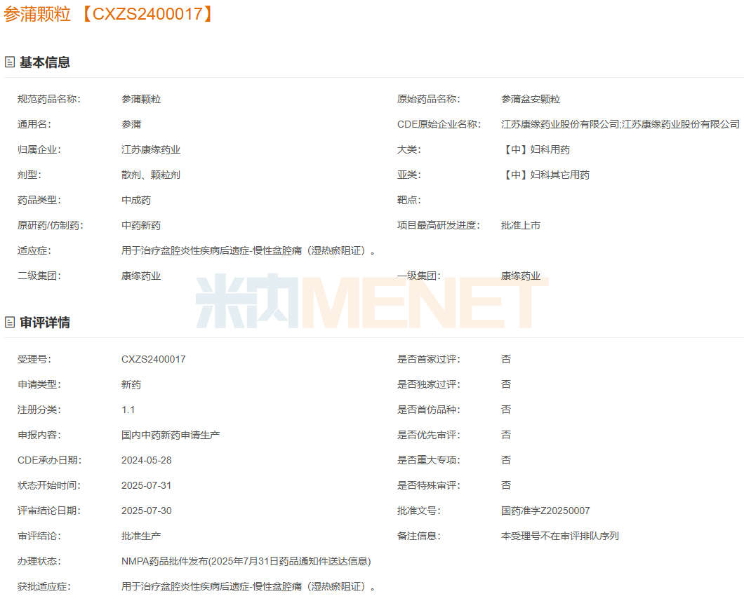 江苏康缘药业的参蒲颗粒功能主治为益气活血,清利湿热,通络止痛;用于盆腔炎性疾病后遗症引起的慢性盆腔痛中医辨证属湿热瘀阻证,症见下腹隐痛、腰骶胀痛、白带量多色黄、经行腹痛加重、胸闷纳呆、口干等,舌体胖大,色红,苔黄腻,脉弦数或滑数。米内网数据显示,妇科中成药在2024年中国三大终端六大市场(统计范围详见本文末)市场规模超过200亿元,同比增长4.13%。康缘药业表示,妇科是公司重点布局的领域之一,参蒲颗粒获批上市,不仅丰富公司妇科产品梯队,有助于提升公司产品在该领域的市场竞争力和品牌影响力,更进一步提升公司盈利能力。