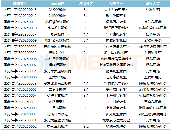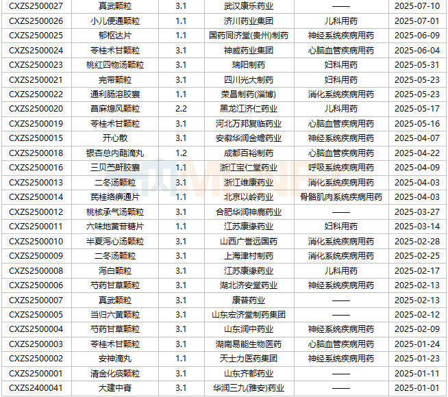 2025年前三季度,国家药监局共批准20款中药新药上市,数量已超过2024年全年。其中,中药1类新药有6款,分别是江苏康缘药业的参蒲颗粒、广东方盛健盟药业的养血祛风止痛颗粒、健民药业集团的小儿牛黄退热贴膏、新疆银朵兰药业的复方比那甫西颗粒、北京以岭药业的芪防鼻通片、北京东方运嘉药业的小儿黄金止咳颗粒。