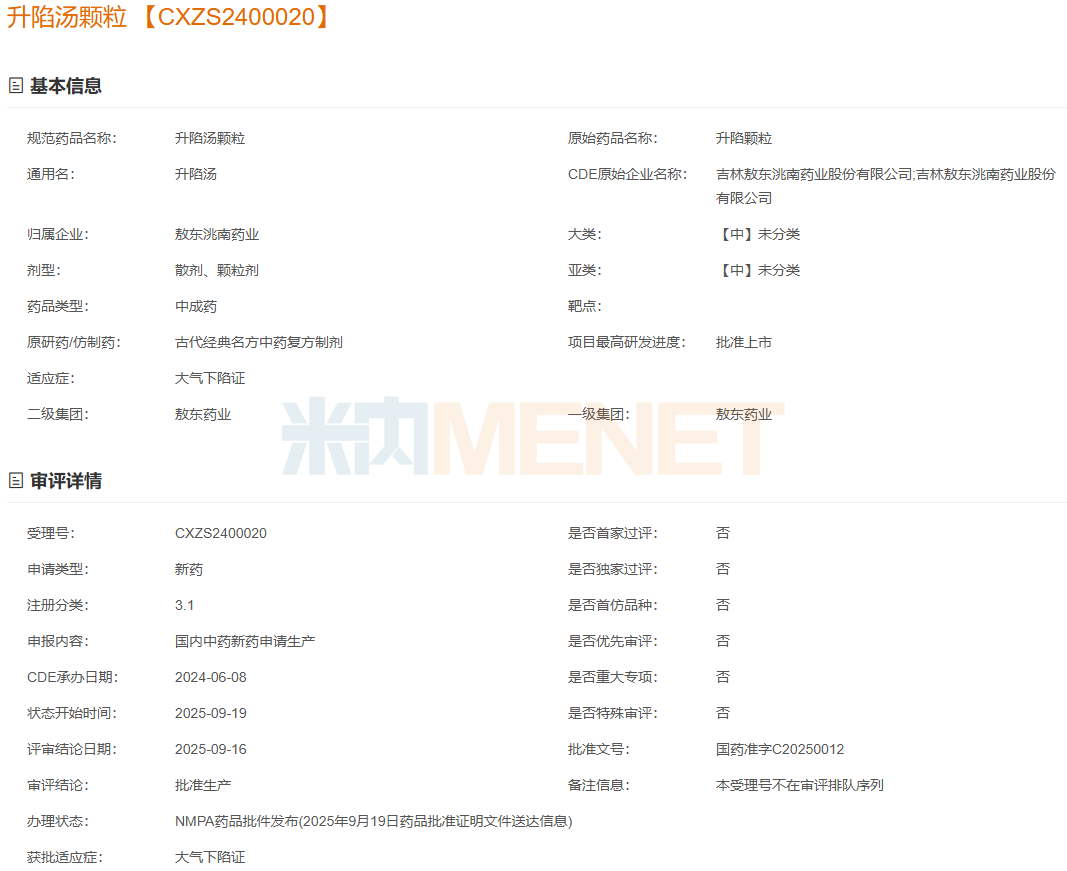 敖东洮南药业的升陷汤颗粒有益气升陷功效,用于大气下陷证。症见气促急短,呼吸困难,脉沉迟微弱,或参伍不调。米内网数据显示,敖东洮南药业为升陷汤颗粒首家获批企业,也是公司继枇杷清肺饮颗粒、一贯煎颗粒后,又一款古代经典名方中药复方制剂产品。资料显示,敖东洮南药业为吉林敖东的控股子公司,目前已形成抗肿瘤、抗病毒、心脑血管疾病、糖尿病、精神类疾病以及中药经典名方等系列产品。