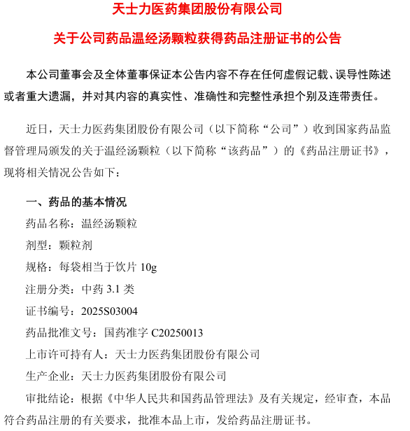 日前,天士力发布公告,公司的温经汤颗粒获批上市。资料显示,温经汤颗粒处方来源于宋•陈自明《妇人大全良方》,并已列入国家中医药管理局发布的《古代经典名方目录(第一批)》。该药品温经补虚,化瘀止痛;用于血海虚寒,气血凝滞证;症见妇人月经不调,脐腹作痛,脉沉紧。天士力表示,此次温经汤颗粒获批,进一步丰富公司的中药产品布局,目前,公司已着手进行生产前的准备工作。