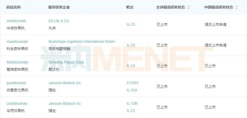 此前,全球有5款IL-23靶向药获批(不含生物类似药),其中乌司奴单抗为IL-12/23p40靶向药物,其余4款均属于IL-23p19靶向药物。市场表现上,艾伯维的利生奇珠单抗、强生的乌司奴单抗及古塞奇尤单抗2024年全球销售额分别达117.18亿美元、103.61亿美元、36.7亿美元。