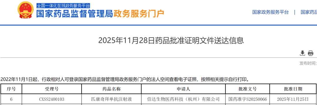 2024年9月,信达生物的匹康奇拜单抗提交NDA获受理;2025年11月顺利获批上市,成为国内获批的首款国产IL-23 p19靶向药物,为中重度斑块状银屑病患者带来新的治疗选择。除了已获批的适应症,该药用于中重度活动性溃疡性结肠炎的适应症已步入II期临床。