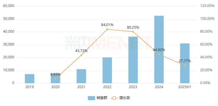 网上药店中成药在2019年卖出47.16亿元,随后每年均有双位数增速,2024年升至241.58亿元,2025上半年增长率为22.30%,高于平均水平。
