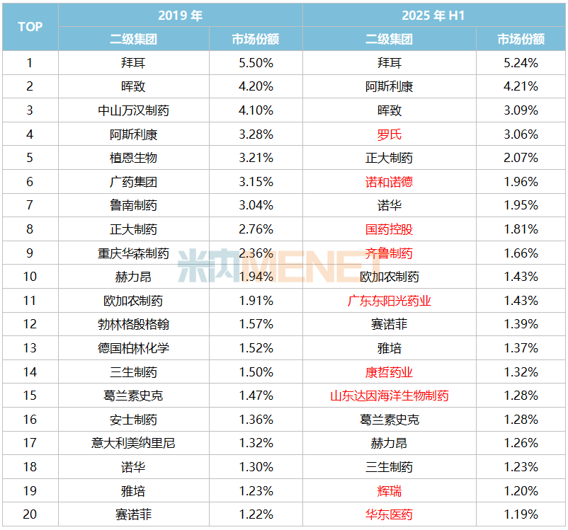 2019年TOP20集团中有11家继续留在了2025上半年的榜单,跨国药企占比较大。其中,阿斯利康由TOP4升上TOP2,诺华由TOP18升上TOP7,欧加农制药由TOP11升上TOP10,赛诺菲由TOP20升上TOP12,雅培由TOP19升上TOP13,国内药企正大制药则由TOP8升上TOP5。