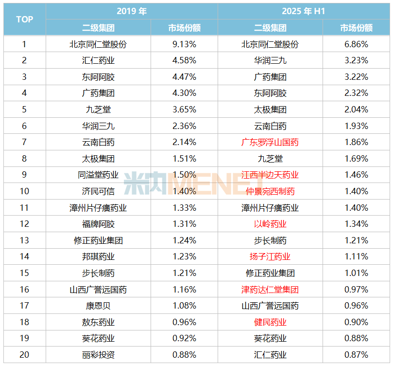 2019年中成药TOP20集团(二级)合揽市场份额为46.36%,2025上半年则下滑至36.66%。