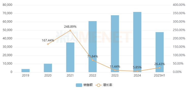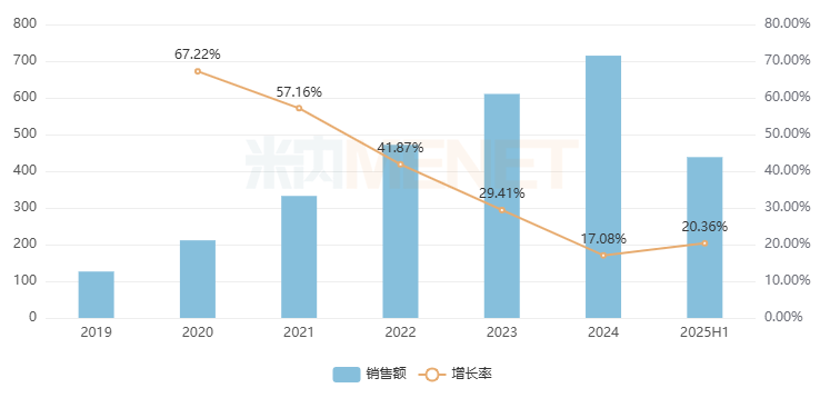 网上药店西药(化+生)2019年大卖79.39亿元,2020年增速高达78.59%,随后增速放缓但依然保持稳定增长,2024年升至473.37亿元,2025上半年增长率为19.36%,略低于平均水平。