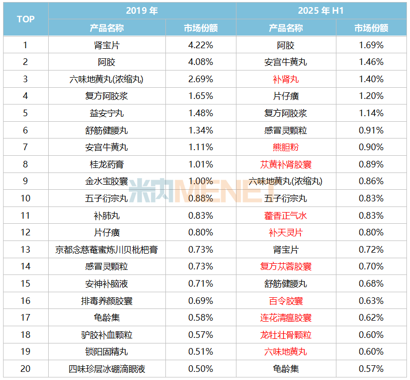 2019年中成药TOP20产品合揽市场份额为26.11%,2025上半年则下滑至18.03%。