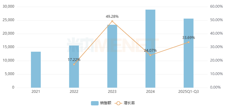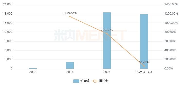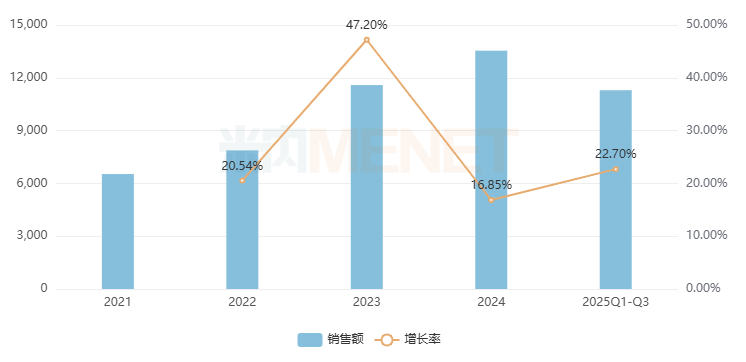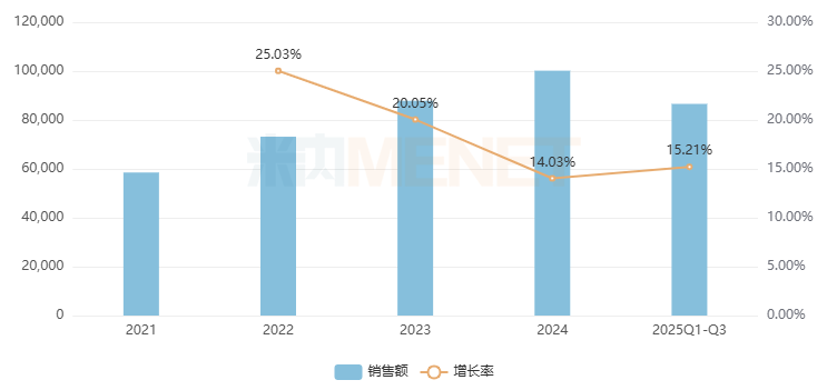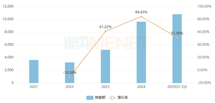 云南白药气雾剂是云南白药集团的独家产品,用于跌打损伤,瘀血肿痛,肌肉酸痛及风湿疼痛。在中国城市实体药店,该品牌自2021年起高速猛涨,2022-2023年增速均超过20%,2024年销售额首次突破10亿元,2025年Q1-Q3增长了15.21%,全年或将冲上11亿元梯队。