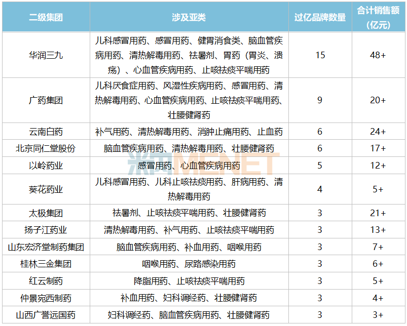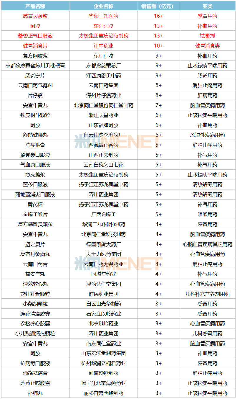 增长率在10%以上(不超过30%)的过亿中成药品牌包括了华润三九医药的小柴胡颗粒、合肥华润神鹿药业的养胃舒颗粒、杭州华润老桐君药业的抗病毒口服液、康臣药业的正骨水、贵州百灵企业集团制药的复方一枝黄花喷雾剂等14个品牌。