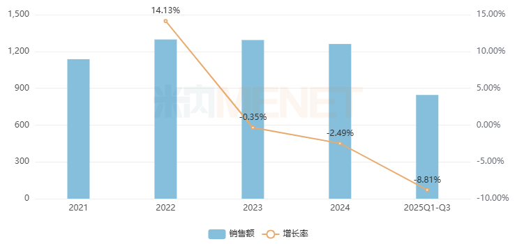 在中国城市实体药店,中成药的销售规模在2016-2019年呈稳步增长态势,2020年“首跌”3.90%,随后恢复快速增长,2022年达到了峰值1297.6亿元,2023-2024年接连下滑了0.35%、2.49%,2025年Q1-Q3跌幅扩大至8.81%,为近10年最大跌幅,市场进入低迷期。