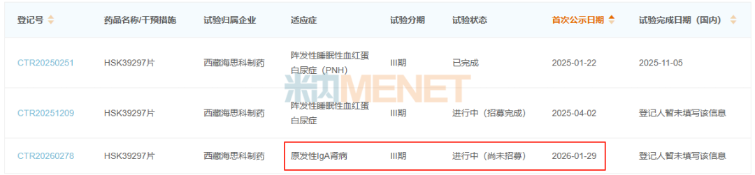 米内网数据显示,HSK39297片在2023年12月首次获批临床,2025年11月该新药完成了阵发性睡眠性血红蛋白尿症(PNH)的III期临床,2026年1月首次提交上市申请,目前正在审评审批中。