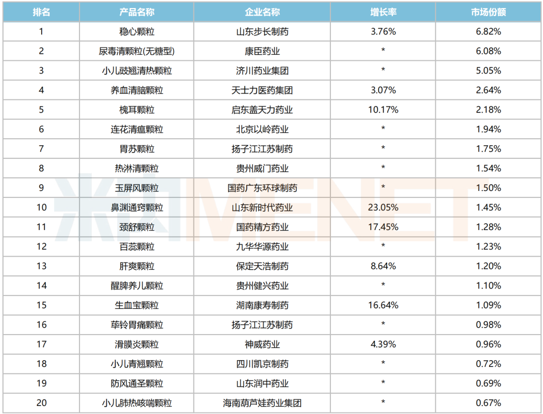 品牌TOP20方面,步长制药的稳心颗粒、康臣药业的尿毒清颗粒(无糖型)、济川药业的小儿豉翘清热颗粒稳居前三,销售额均超13亿元;天士力的养血清脑颗粒排名第四,销售额超6亿元;启东盖天力药业的槐耳颗粒、以岭药业的连花清瘟颗粒先后排在第五和第六,销售额均在5亿元以上。