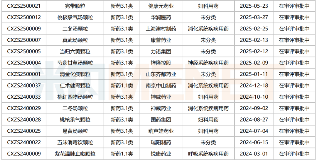 米内网数据显示,截至目前共有49款中成药颗粒剂/散剂新药报产在审,包括7款1.1类新药——康缘药业的苏辛通窍颗粒和双鱼颗粒、以岭药业的小儿连花清感颗粒、济川药业的小儿便通颗粒、悦康药业的紫花温肺止嗽颗粒、星昊医药的疏肝解郁颗粒和南京中山制药的仁术健胃颗粒,1款2.1类新药——康缘药业的热毒宁颗粒,41款3.1类新药——国药集团的清金化痰颗粒、北京同仁堂的芍药甘草汤颗粒、人福医药的真武汤颗粒等。