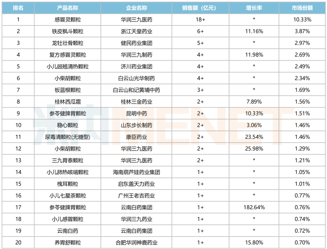 品牌TOP20中,华润三九的感冒灵颗粒蝉联桂冠,也是唯一销售额突破18亿元的上榜品牌;浙江天皇药业的铁皮枫斗颗粒、健民药业的龙牡壮骨颗粒、华润三九的复方感冒灵颗粒、济川药业的小儿豉翘清热颗粒、白云山的小柴胡颗粒相继排在第二至第六,销售额均在4亿元以上。TOP1-TOP6品牌市场份额均超过2%。