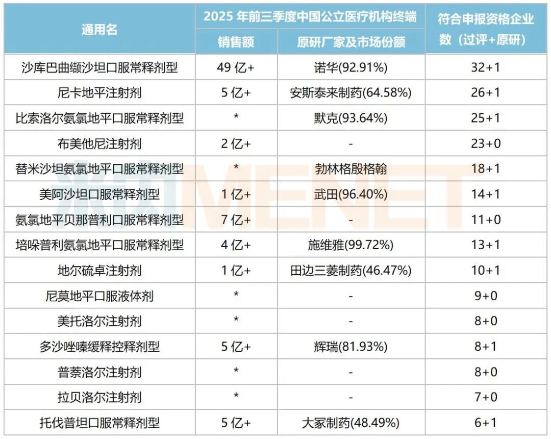 2025年前三季度中国公立医疗机构终端高血压化药TOP20产品市场份额合计超过65%。其中,沙库巴曲缬沙坦钠片以近50亿元稳居首位,诺华独占市场份额超九成;硝苯地平控释片以超25亿元紧接其后,拜耳独占市场份额超五成;琥珀酸美托洛尔缓释片以近20亿元排位第三,较2024年提升1个位次,阿斯利康独占市场份额超六成。