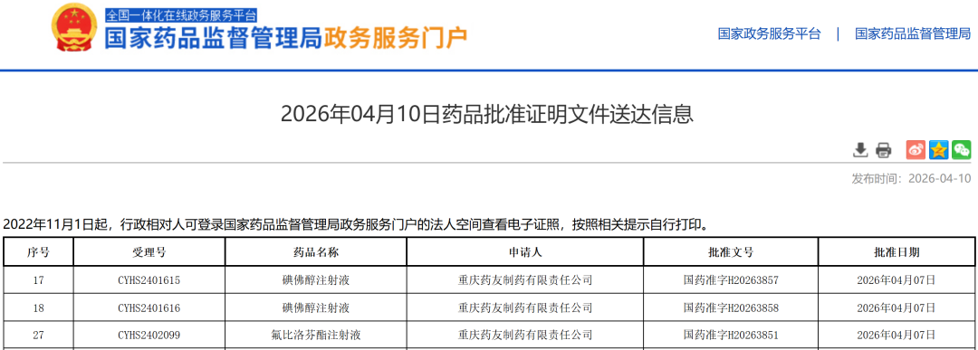 近日,国家药监局官网显示,重庆药友制药2款注射剂同日获批生产并视同过评,其中碘佛醇注射液为公司获批的首款造影剂,氟比洛芬酯注射液为第5家过评。米内网数据显示,碘佛醇注射液、氟比洛芬酯注射液2025年在中国三大终端六大市场的销售额分别超过30亿元、10亿元。