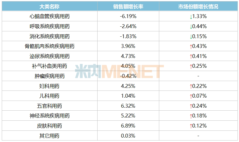从市场份额提升情况来看,13个大类中骨骼肌肉系统疾病用药、泌尿系统疾病用药在2024年提升了0.4个百分点,潜力不容小觑。