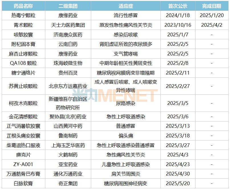 表1:2025年1-5月完成/公示III期临床的中药新药