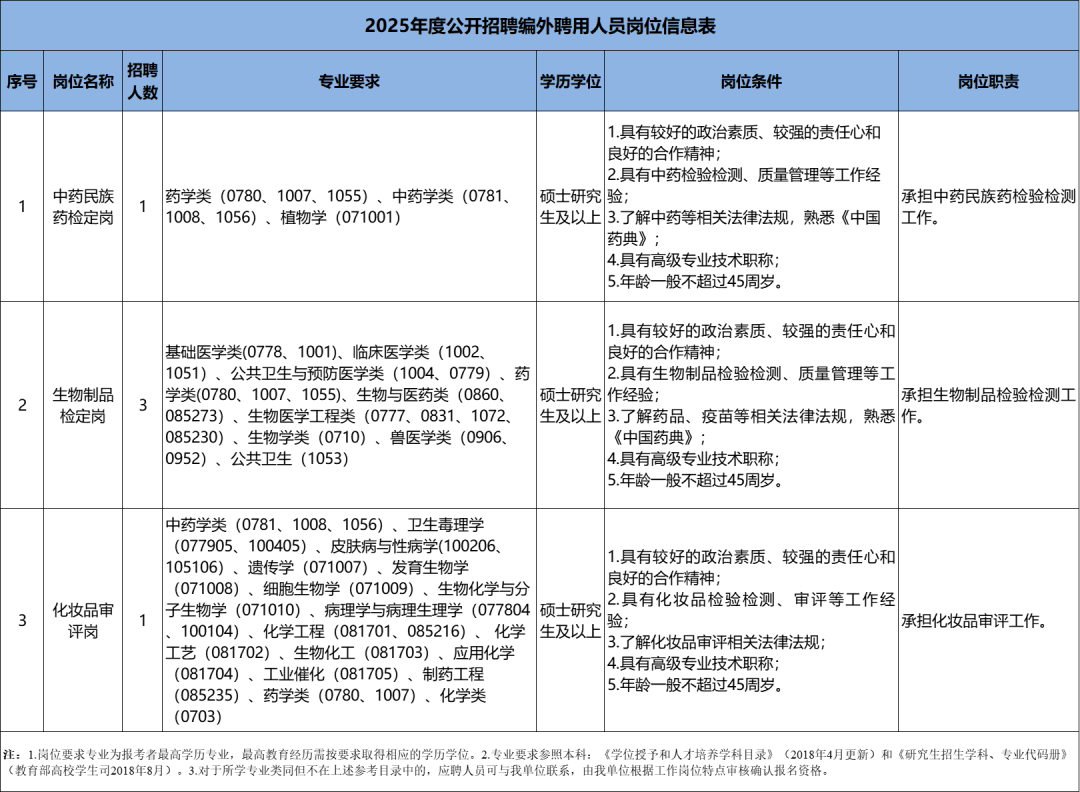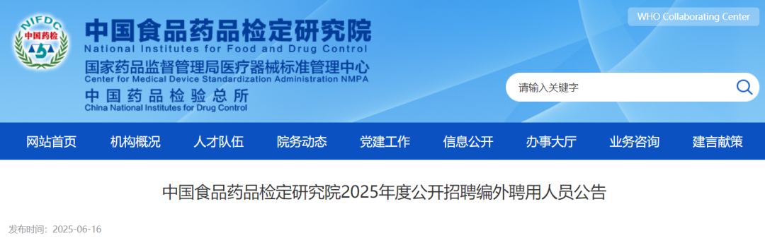 2025年06月16日,根据工作需要,中检院公开招聘编外聘用工作人员5名,报名时间截止6月25日,本次招聘人员不占事业编制,不解决北京户口,工作地点在北京。