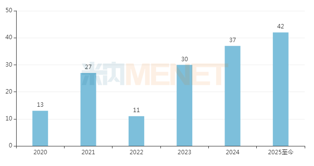 随着“三医”协同机制改革持续深化,全链条支持创新药发展规划加快推进,创新药审评审批步伐不断提速,国产1类新药近年来获批数量快速攀升。2021年获批了27个(不含中成药,下同),数量同比翻一番;2022年受疫情影响有所回落,2023-2024年均达30个及以上;2025年至今已有42个获批,已超越去年全年水平。