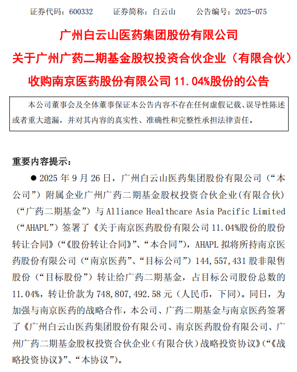 9月28日,广药集团旗下上市公司广州白云山医药集团股份有限公司(以下简称“白云山”)与南京医药股份有限公司(以下简称“南京医药”)同时发布公告,白云山旗下广州广药二期基金股权投资合伙企业(有限合伙)(以下简称“广药二期基金”)拟出资748,807,492.58元人民币收购Alliance Healthcare Asia Pacific Limited(“AHAPL”)持有的南京医药股份144,557,431股非限售股份,占南京医药总股份数的11.04%。收购完成后,广药二期基金拟将成为南京医药第二大股东。