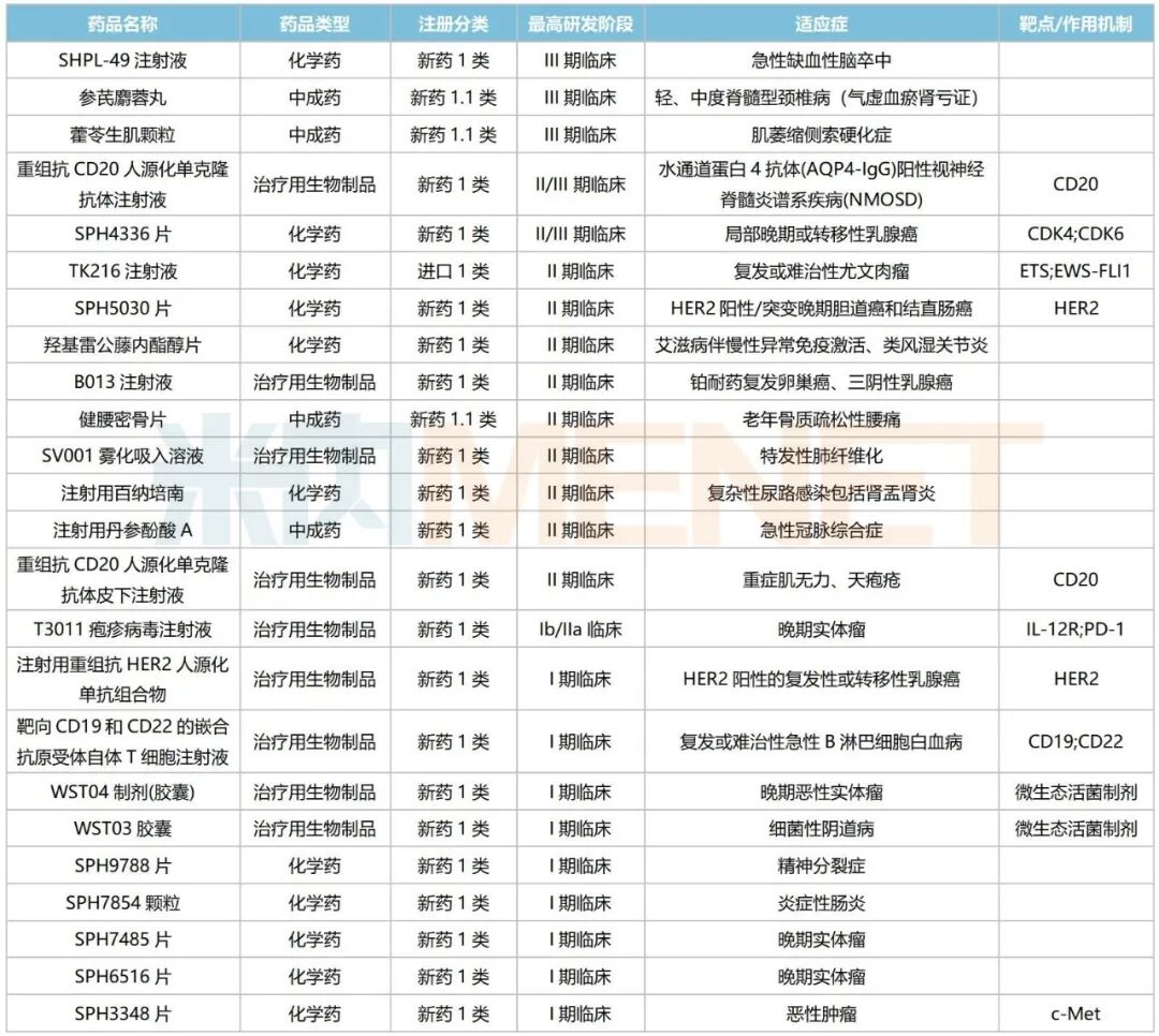 化学药聚焦肿瘤、神经系统等领域,其中SHPL-49注射液处于III期临床,该药具有多靶点、多通路的神经保护作用机制,用于治疗急性缺血性脑卒中(AIS);SPH4336片处于II/III期临床,适应症为局部晚期或转移性乳腺癌,该药是一款新型高选择性CDK4/6抑制剂;此外,TK216注射液、SPH5030片、羟基雷公藤内酯醇片等处于II期临床。