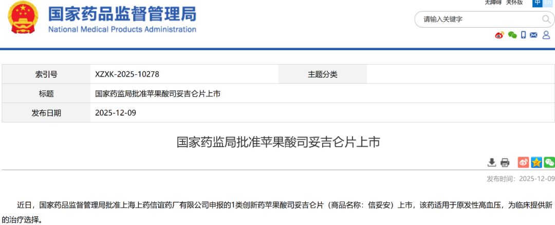 12月9日,国家药监局官网显示,上海医药申报的1类新药苹果酸司妥吉仑片(商品名称:信妥安)获批上市,为原发性高血压患者带来新的治疗选择。