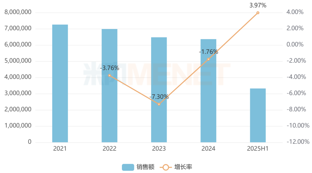中成药主攻骨骼肌肉系统疾病,参芪麝蓉丸、藿苓生肌颗粒均处于III期临床,分别用于治疗轻/中度脊髓型颈椎病(气虚血瘀肾亏证)、肌萎缩侧索硬化症;健腰密骨片处于II期临床,用于治疗老年骨质疏松性腰痛。米内网数据显示,近年来中国三大终端六大市场骨骼肌肉系统中成药销售额逐年上涨,2024年超过420亿元,2025年上半年超过210亿元。