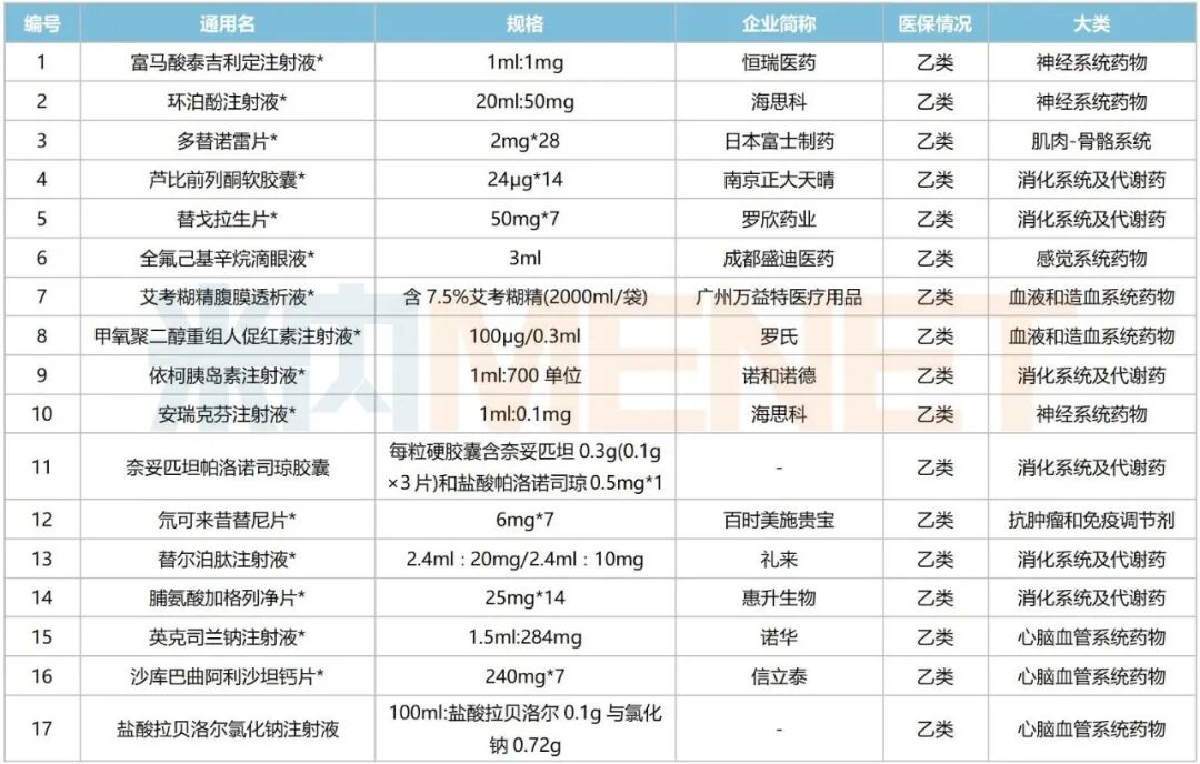 17个新药均为国谈药,目前均已纳入国家医保乙类目录,主要集中在消化系统及代谢、神经系统、心脑血管系统等治疗领域,可见以慢病药、常见病药为主。